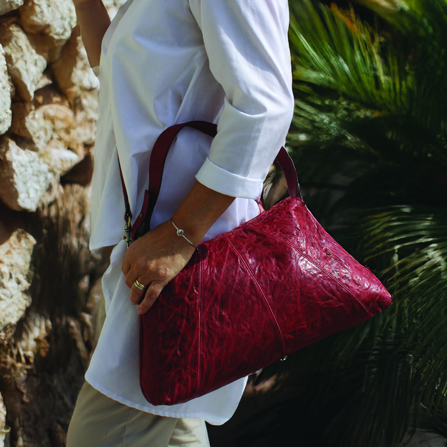 Mia elegante e grintosa. Caratterizzata da una forma geometrica che la rende cool. Realizzata in pelle liscia e caratterizzata da una pratica chiusura a zip. Dotata di un manico arricchito da gemello e da una tracolla extra per portarla a spalla. Dimensioni: 40 x 23 x 13 cm