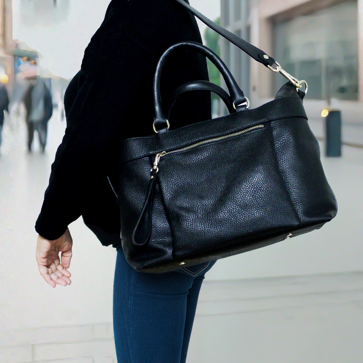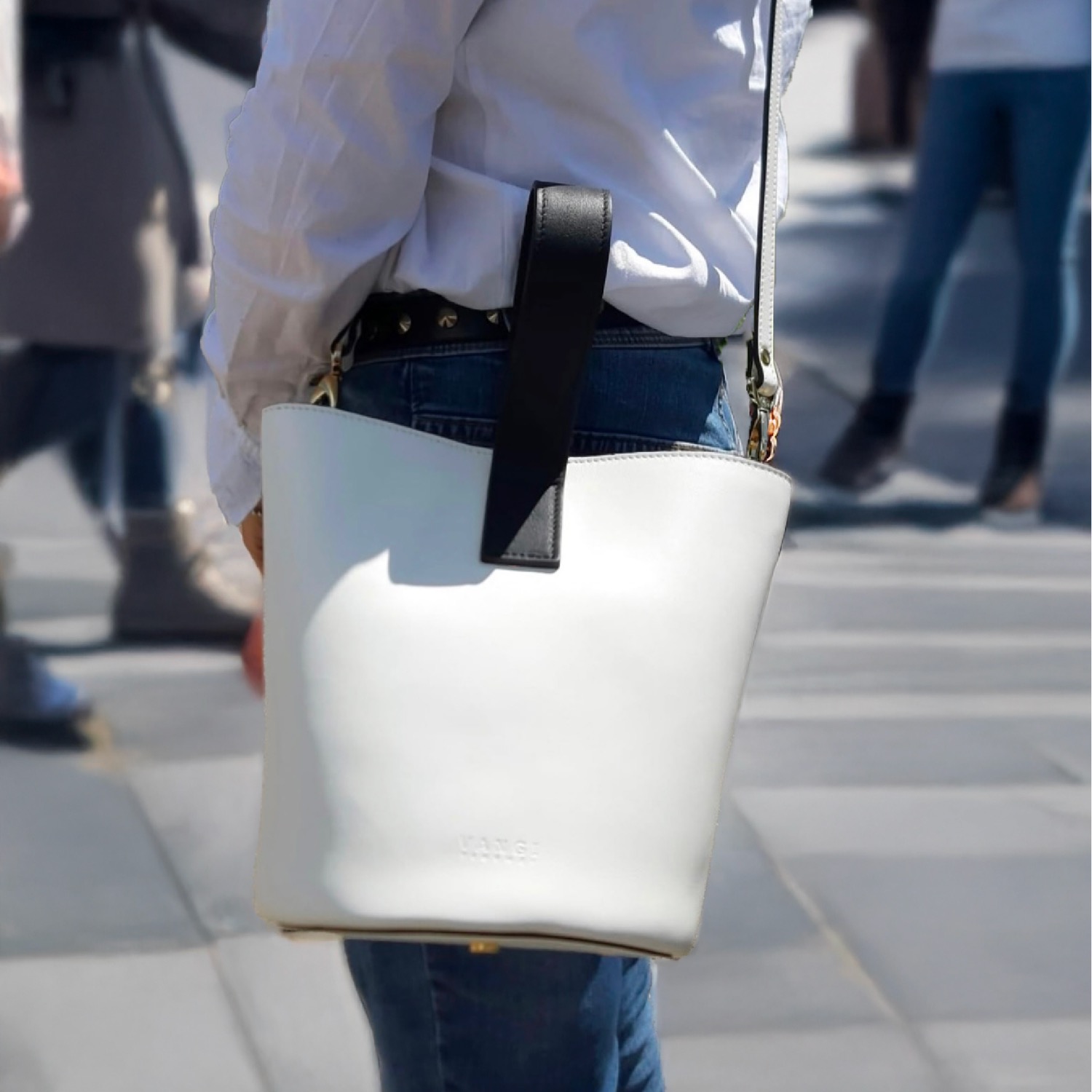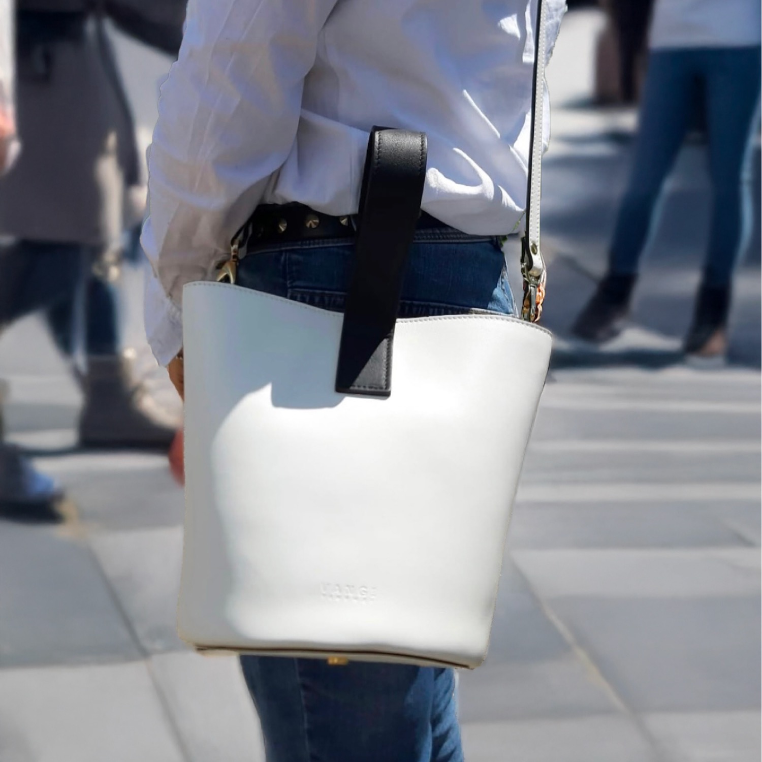 Eleonora semplice ed elegante. Realizzta in pelle liscia. Caratterizzata da una pratica chiusura a calamita arricchita dal manico a mano e dotata di una tracolla regolabile e removibile in tessuto. Dimensioni: 23 x 27 x 18 cm