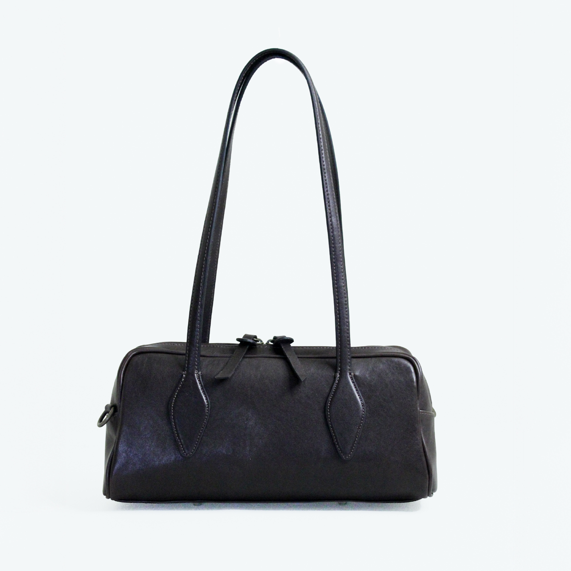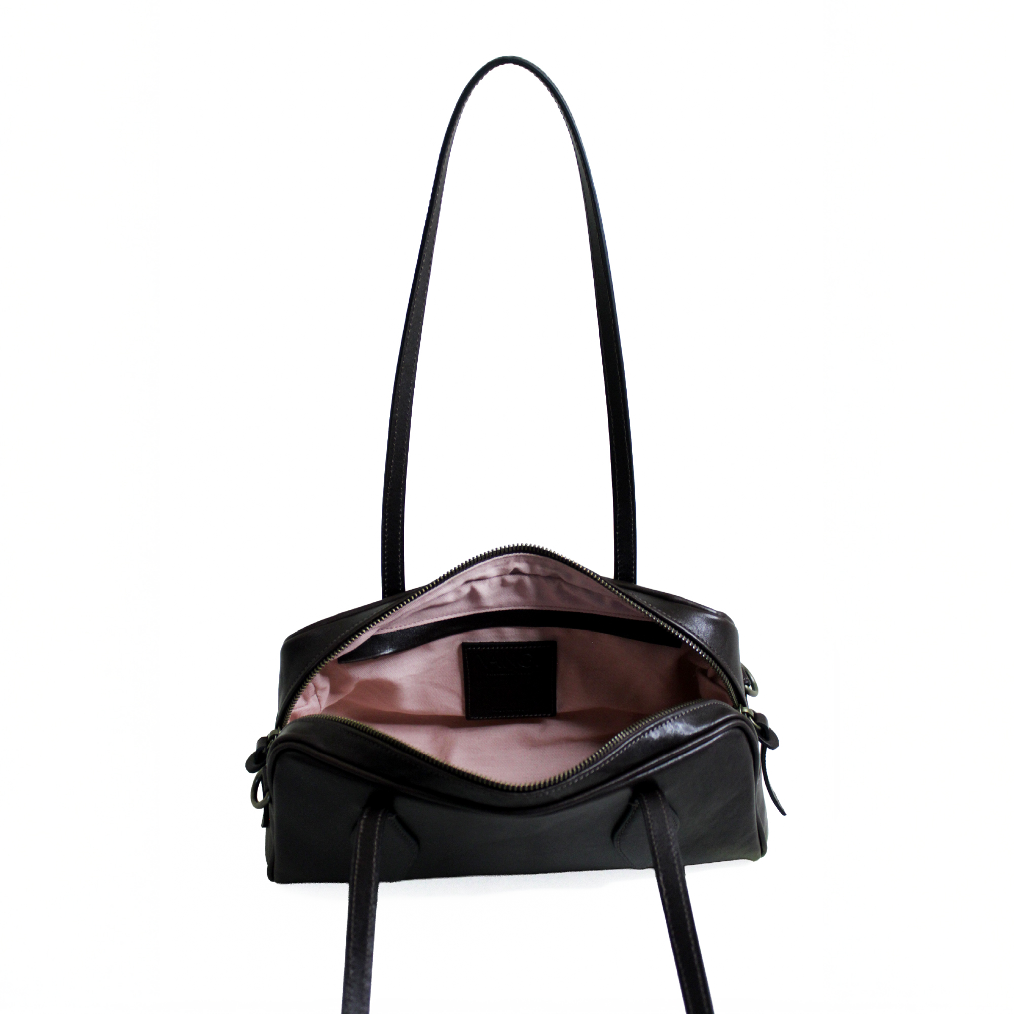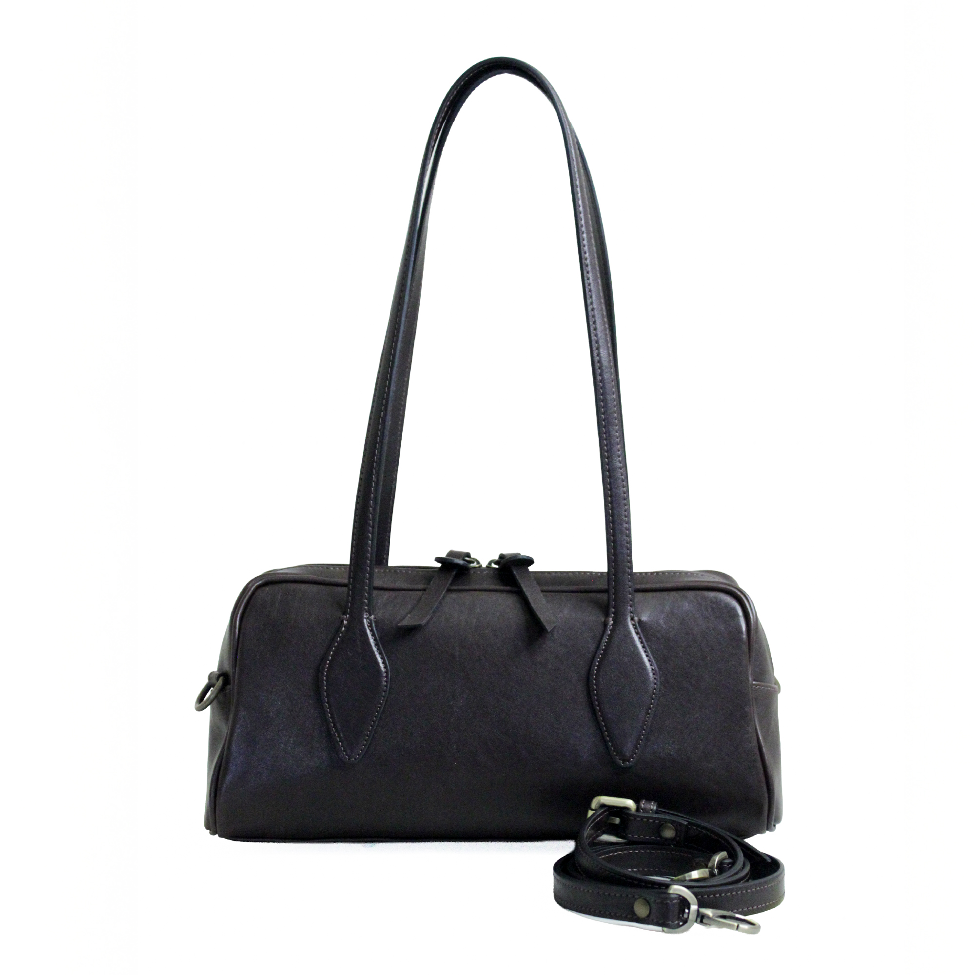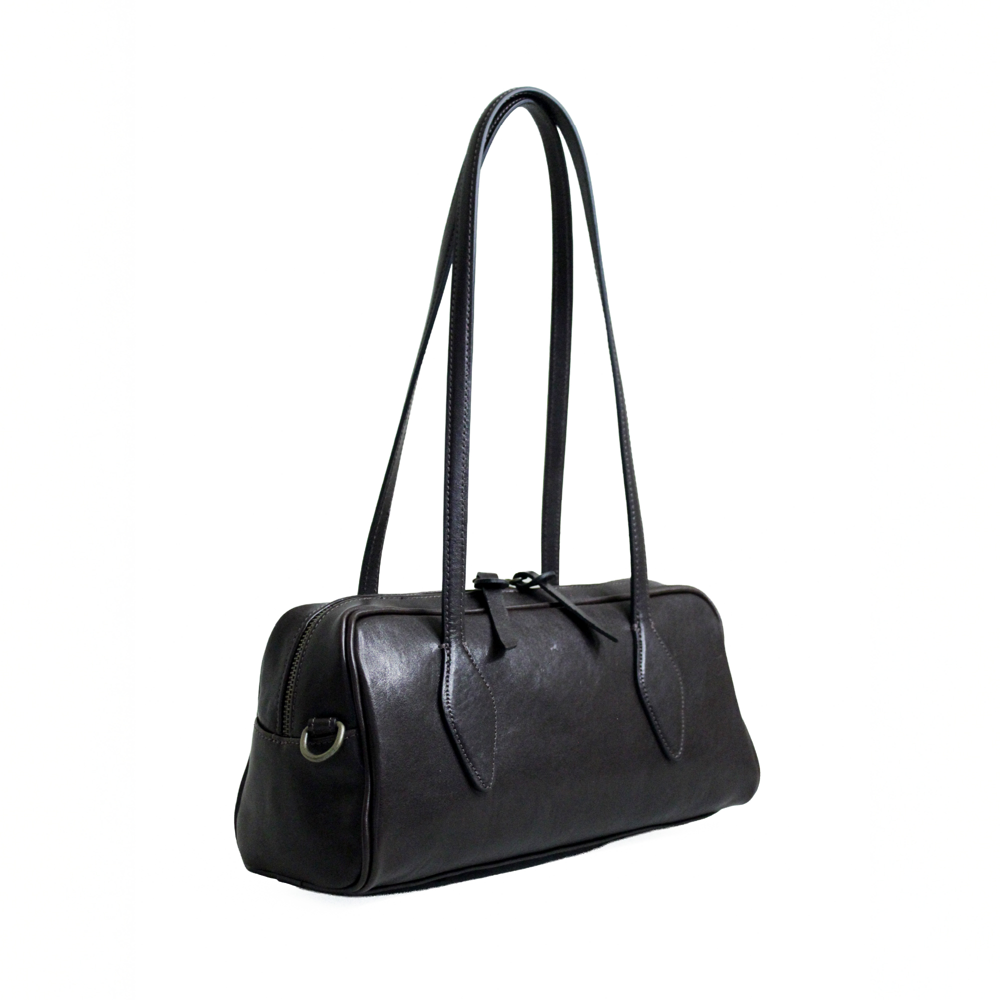Aurora la borsa bowling. Realizzata in pelle liscia è dotata di chiusura a zip. Arricchita da due manici dalla forma particolare da portare a spalla e dotata di una tracolla extra per utilizzo crossbody. Dimensioni 32 x 15 x 12 cm