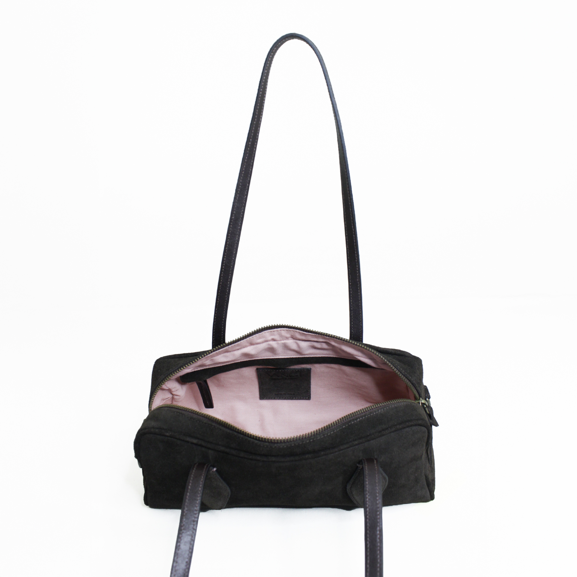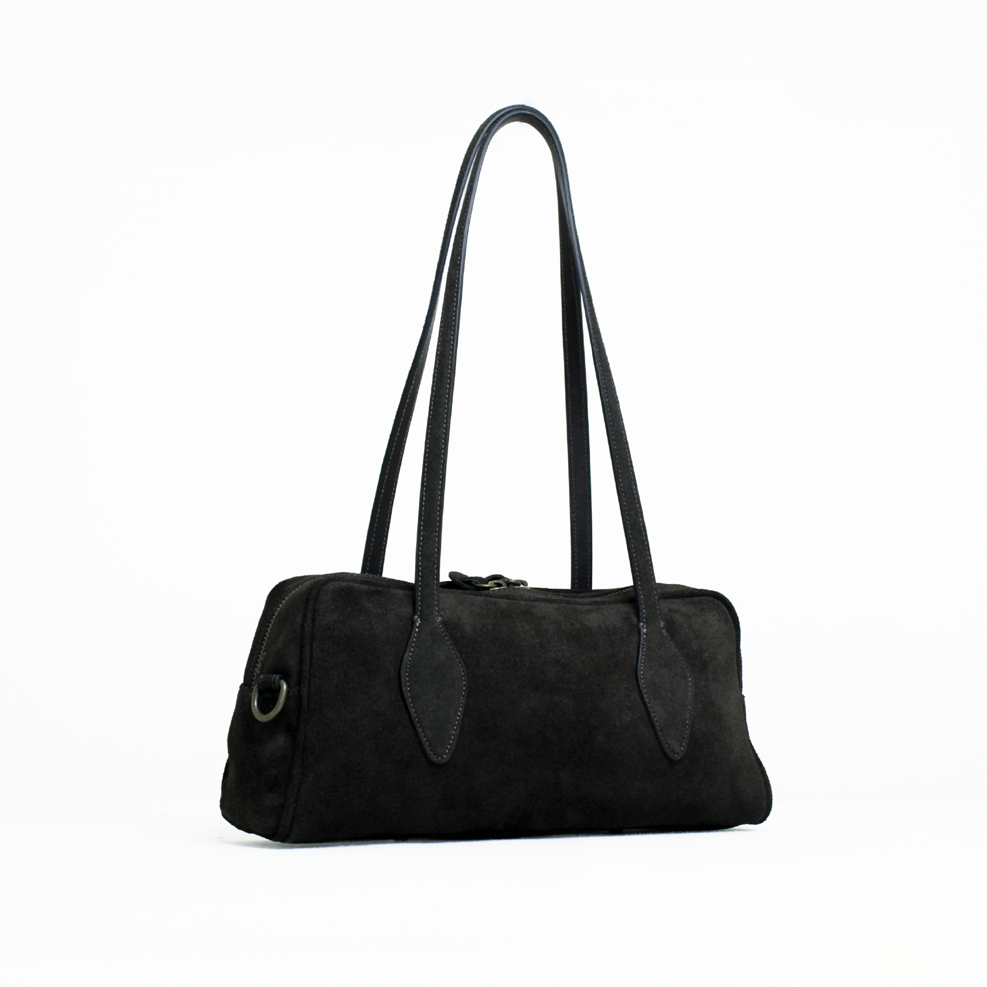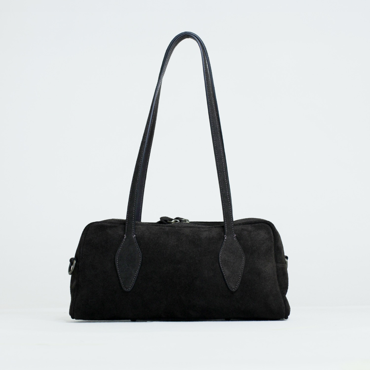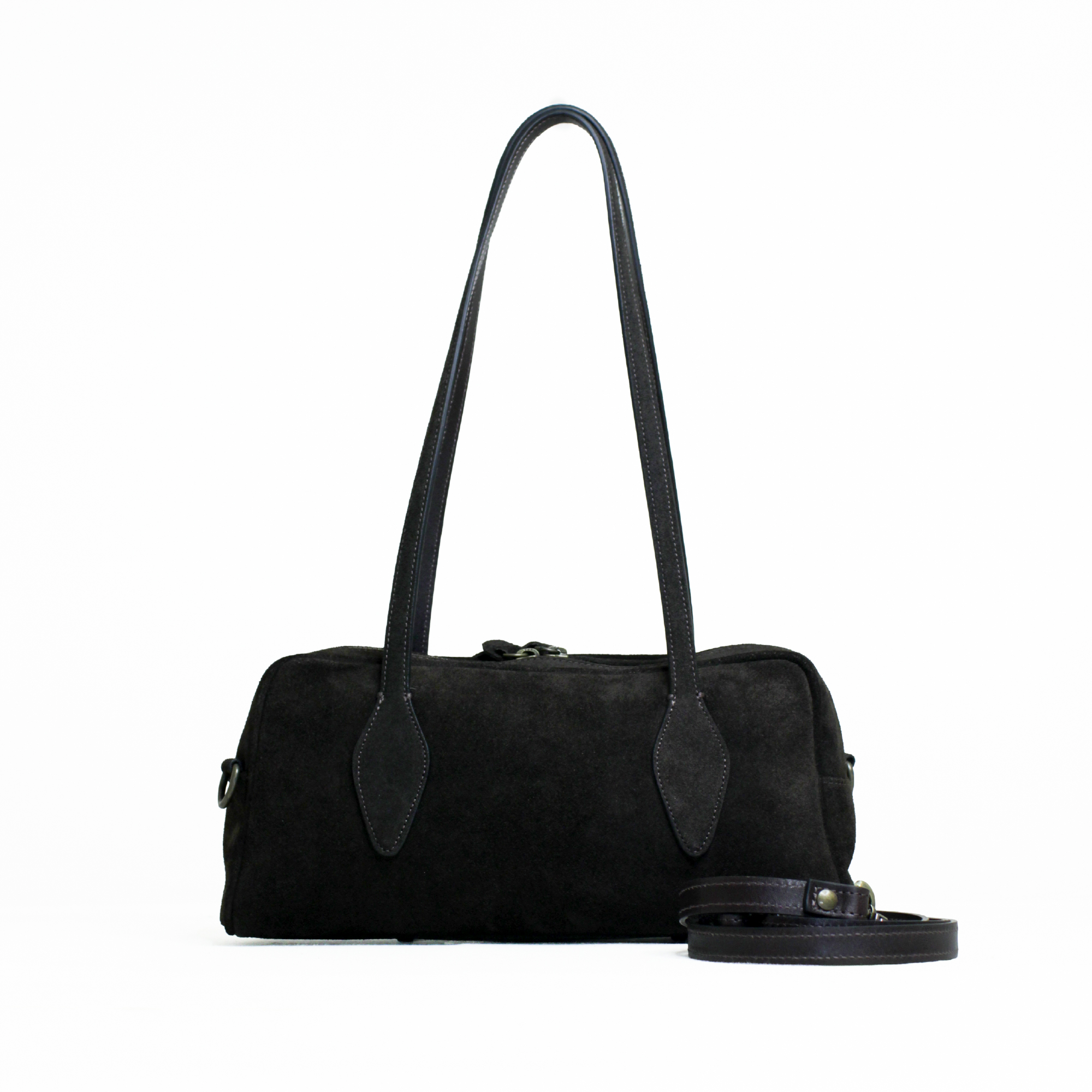 Aurora la borsa bowling. Realizzata in pelle suede è dotata di chiusura a zip. Arricchita da due manici dalla forma particolare da portare a spalla e dotata di una tracolla extra per utilizzo crossbody. Dimensioni 32 x 15 x 12 cm