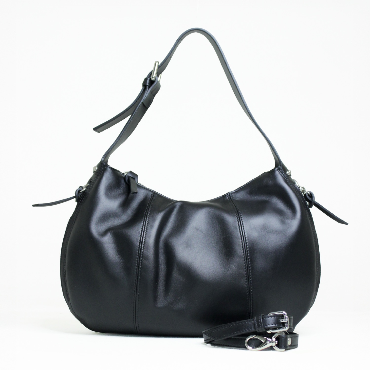 Clea realizzata in pelle liscia morbida. E’ caratterizzata da una pratica chiusura a zip. Arricchita da una fibbia al manico p4er regolare la tracolla e una tracolla extra per un utilizzo crossbody. Dimensioni 39 x 23 x 12 cm