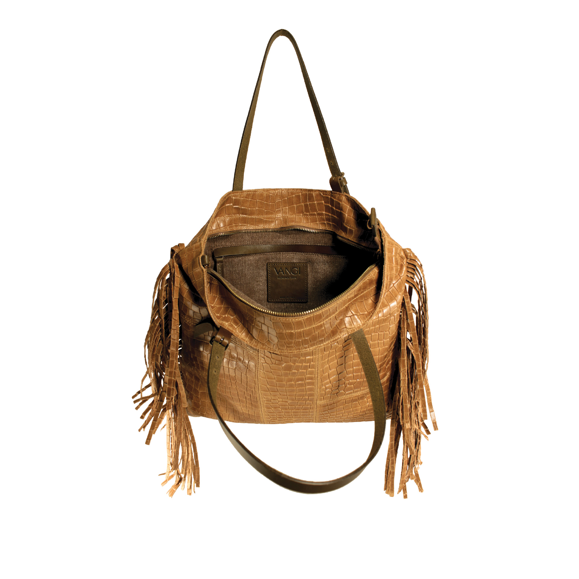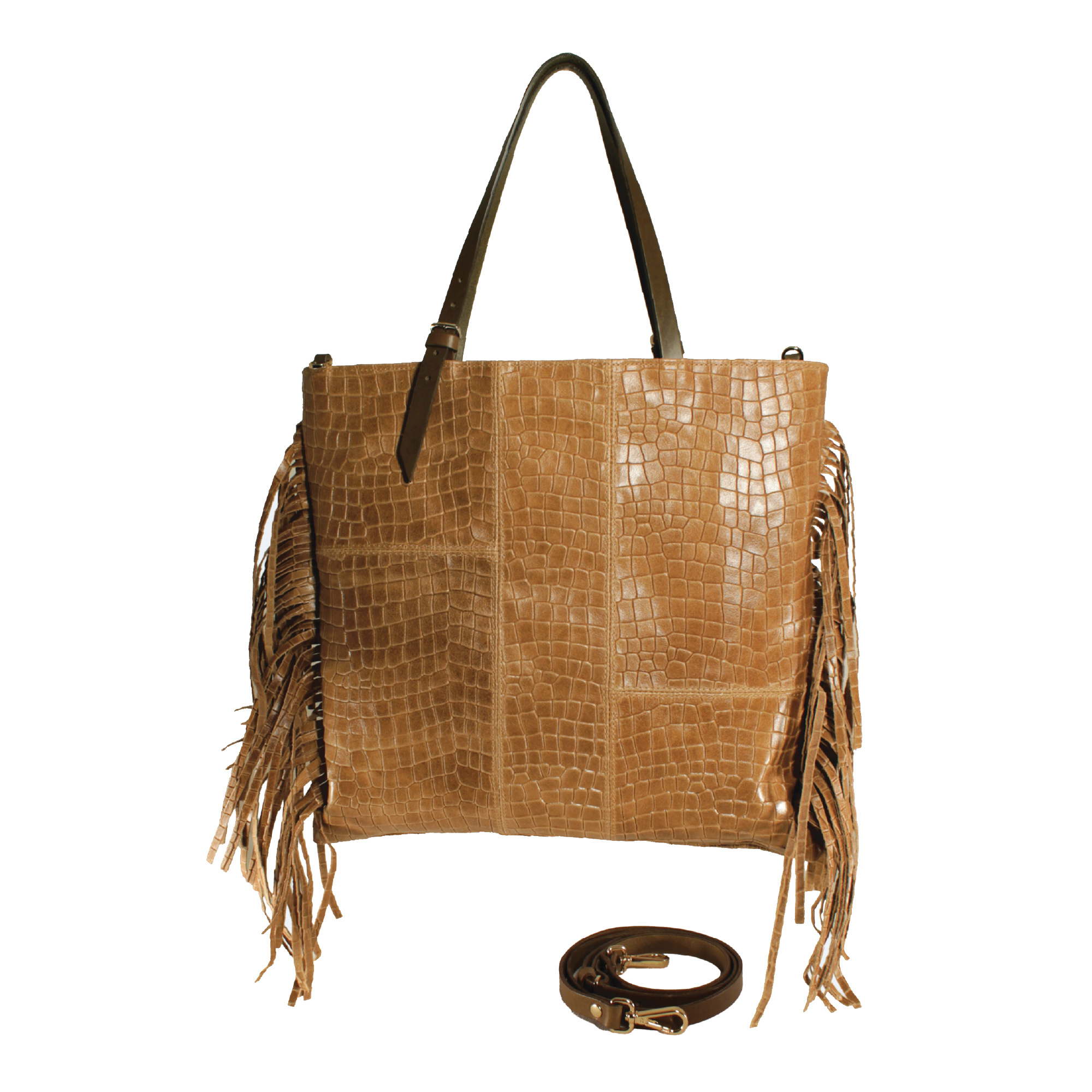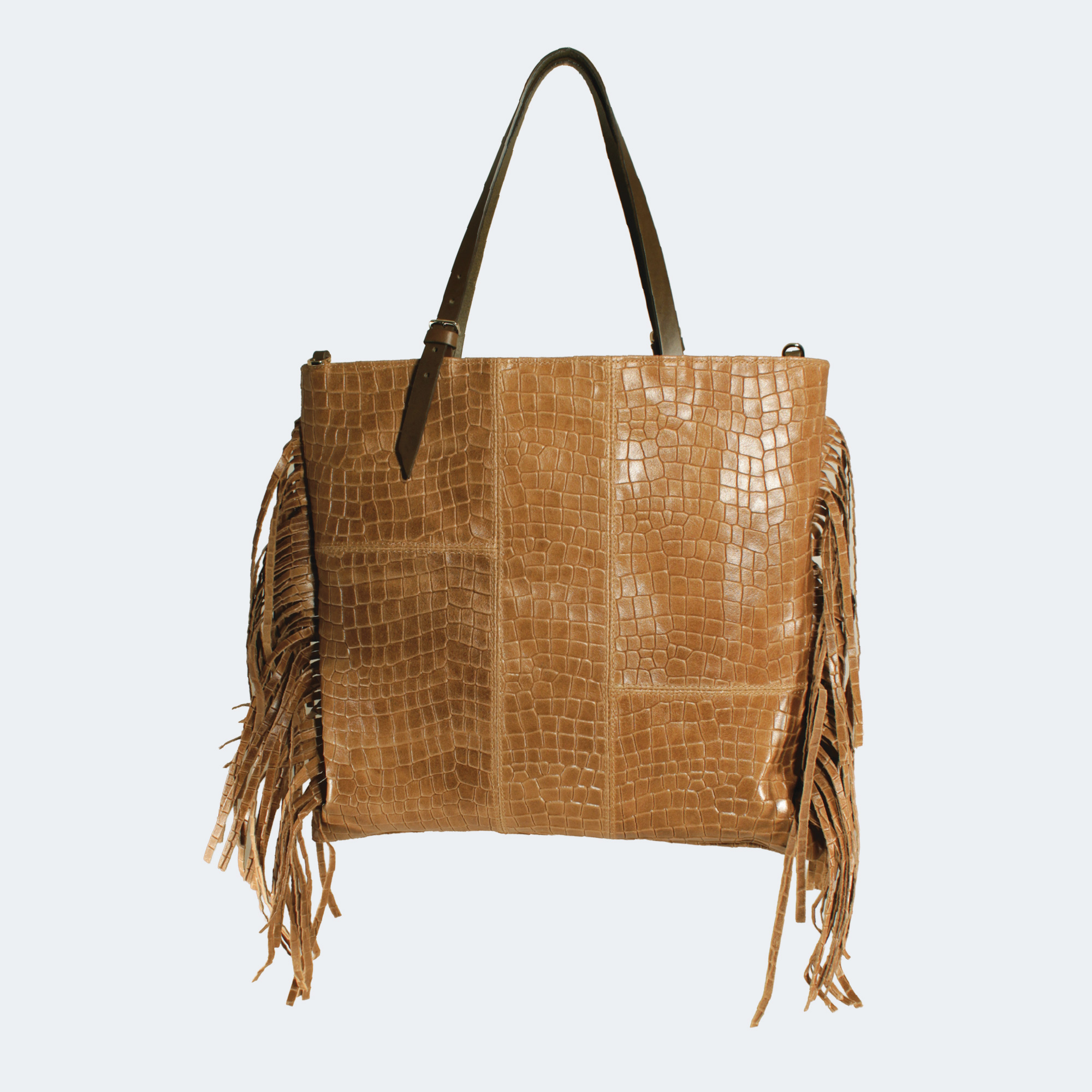 Giorgia realizzata in morbida pelle stampa cocco. Il design è arricchito da frange che donano movimento ed un tocco chic, perfette per outfit casual e ricercati. Presenta due manici per portarla a spalla e dotata di una tracolla extra per utilizzo crossbody. Dimensioni 38 x 35cm
