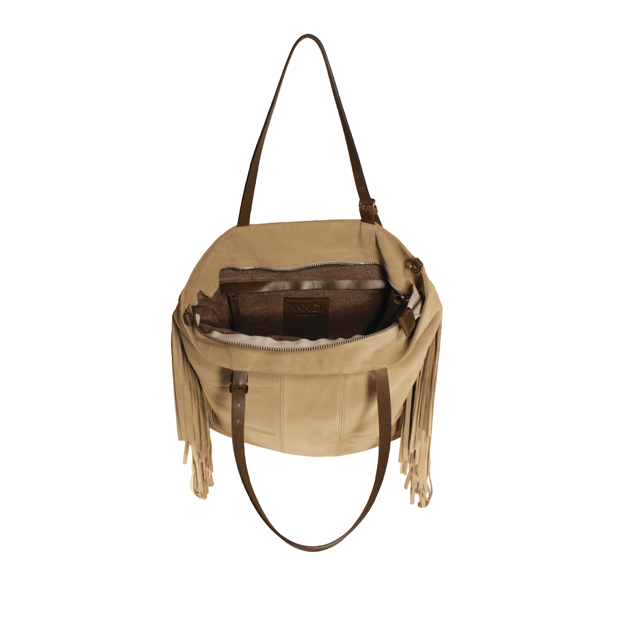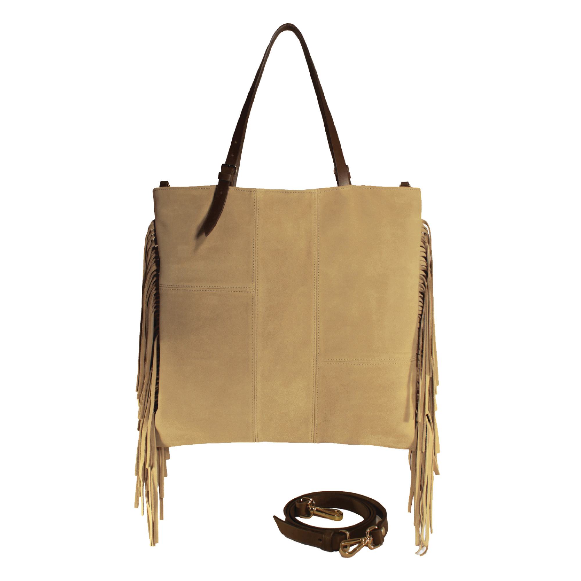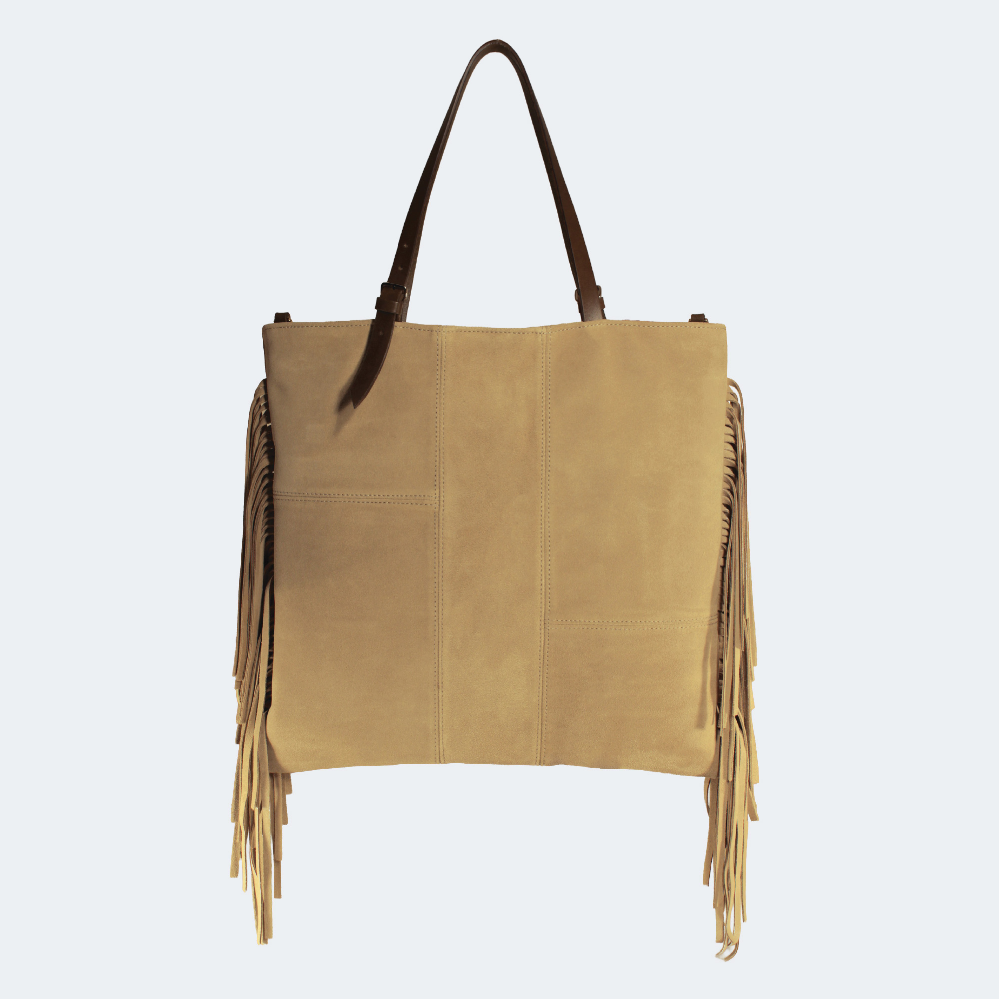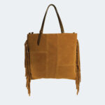 Giorgia realizzatain morbida pelle suede. Il design è arricchito da frange che donano movimento ed un tocco chic, perfette per outfit casual e ricercati. Presenta due manici per portarla a spalla e dotata di una tracolla extra per utilizzo crossbody. Dimensioni 38 x 35cm