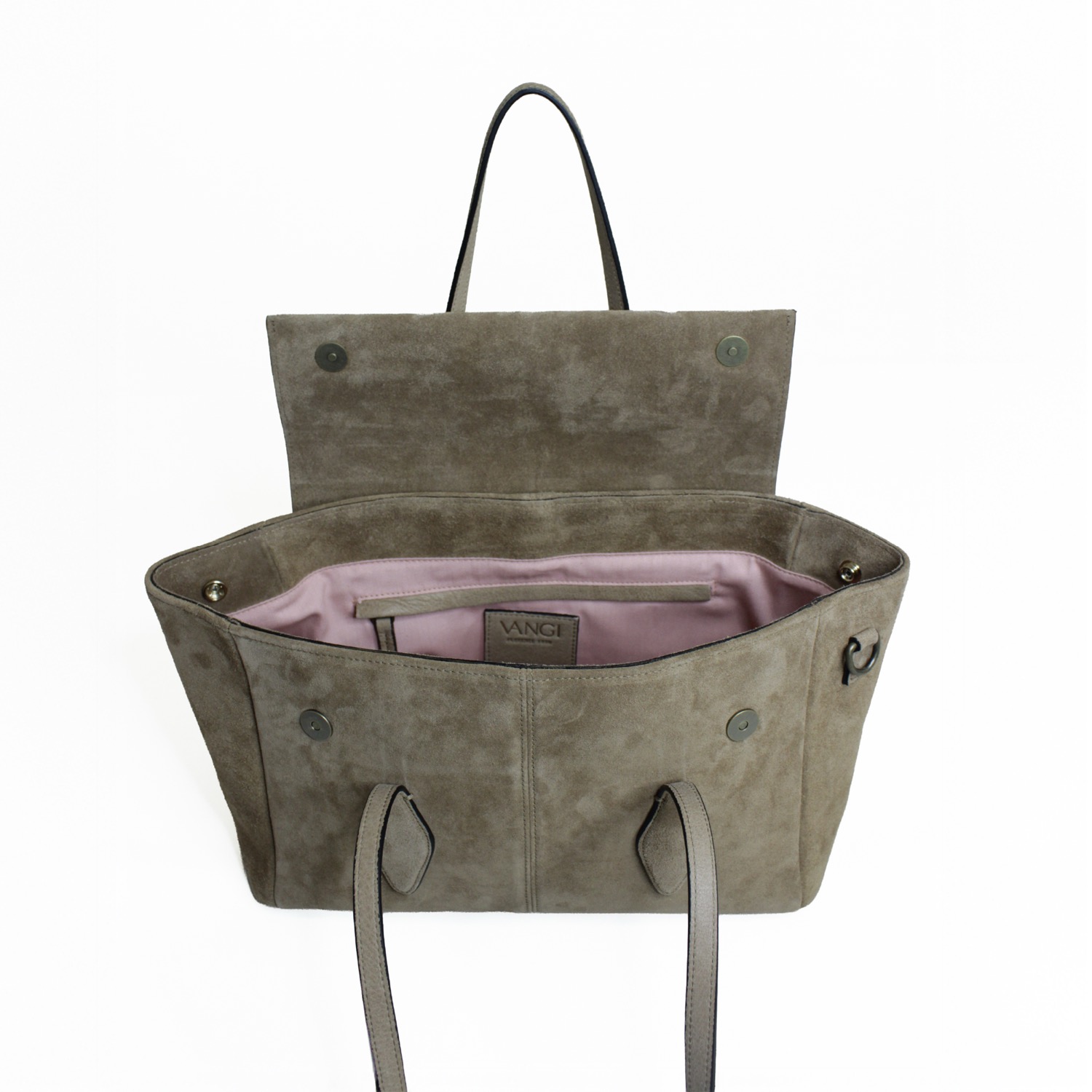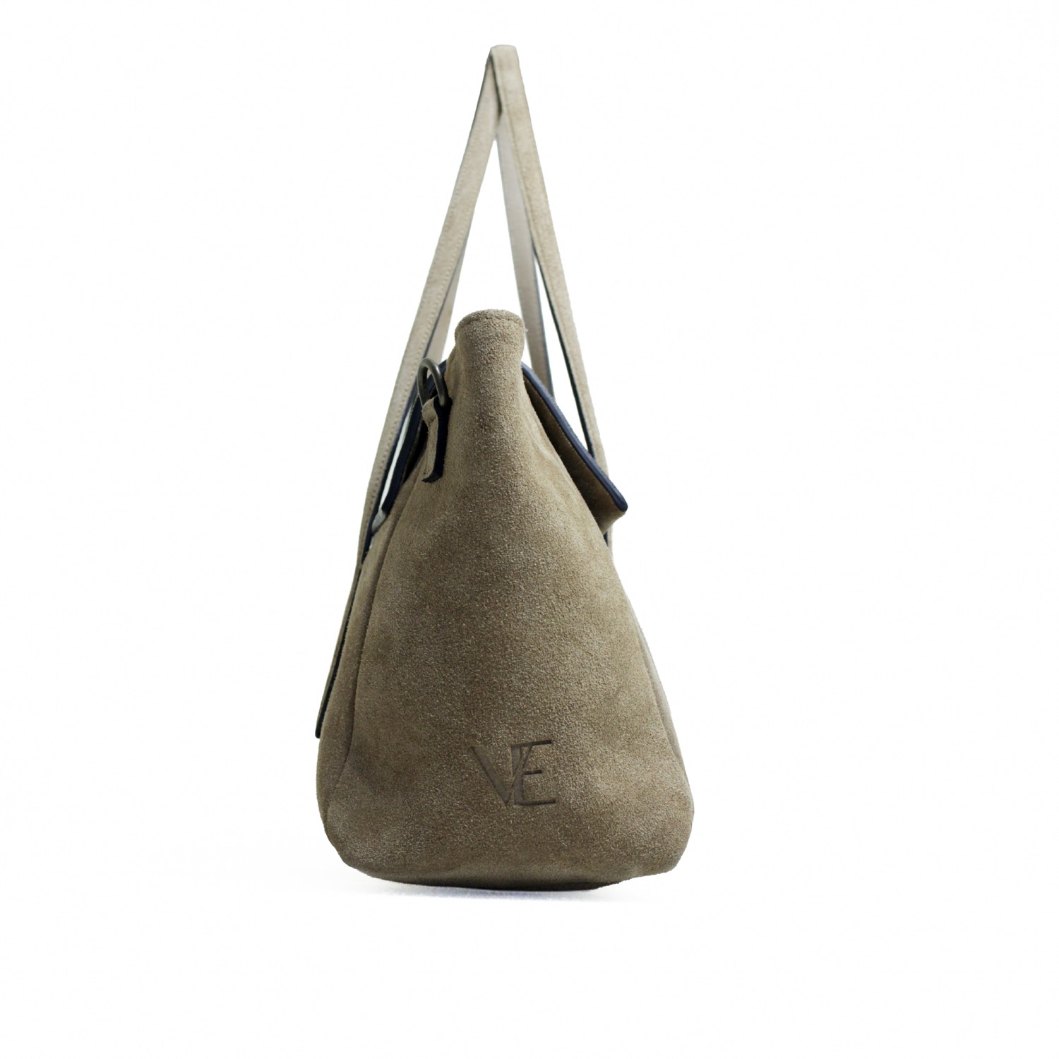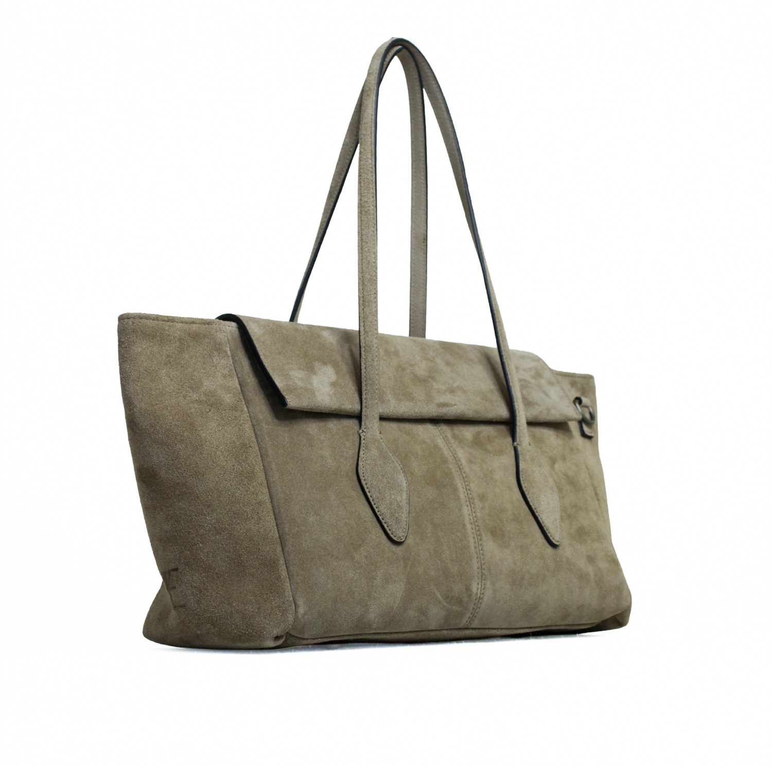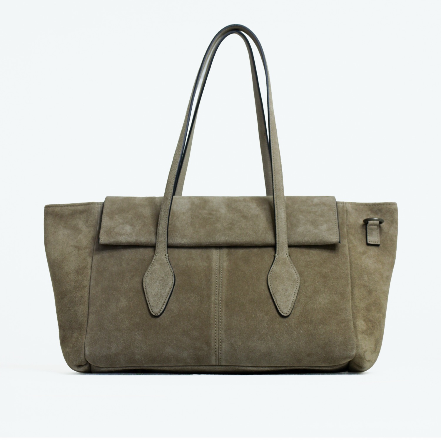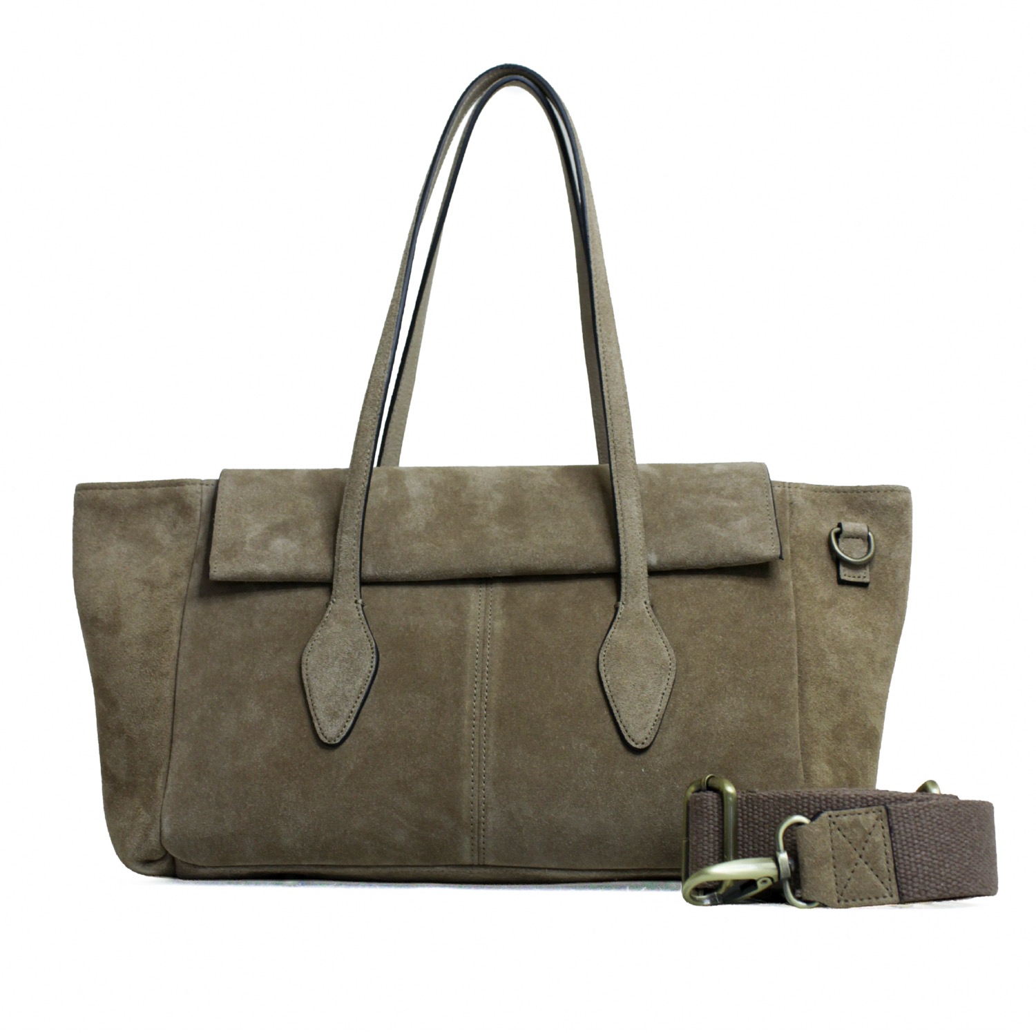 Hope elegante e moderna. Realizzata in pelle suede, con una chiusura con patta e arricchita da due manici dalla forma particolare pa portare a spalla e dotata di una tracolla extra per utilizzo crossbody. Dimensioni 46 x 24 x 14 cm